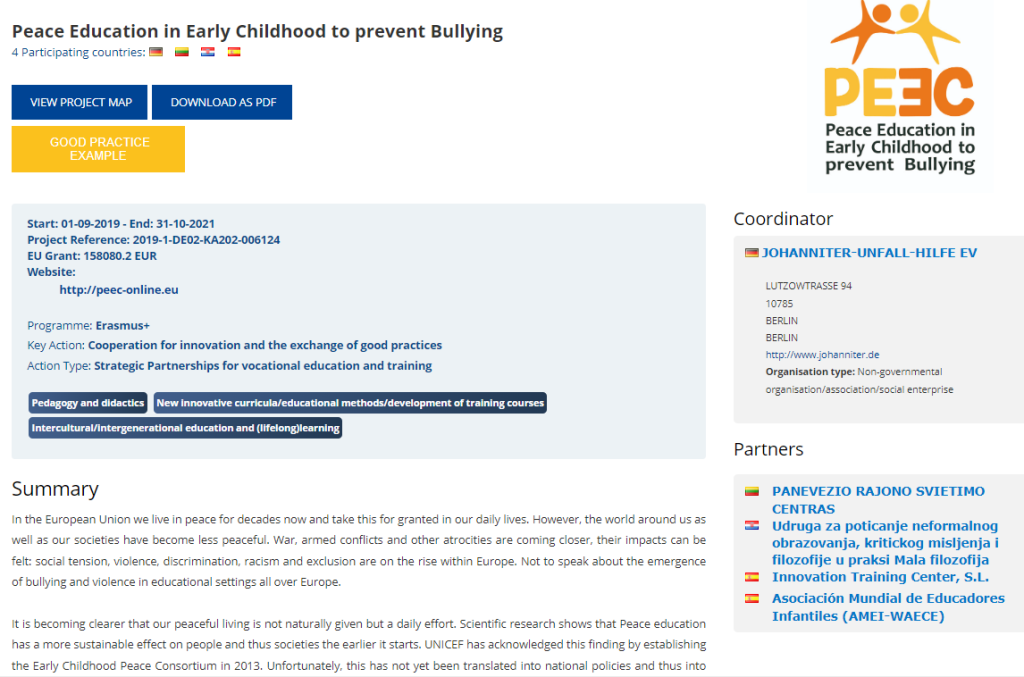 Tenemos el placer de informaros que nuestro PROYECTO PEEC ha sido seleccionado como buena práctica en el portal de resultados de Erasmus+. “Peace Education in Early Childhood to prevent Bullying – Educación para la paz en la primera infancia para prevenir el acoso escolar» (PEEC) tiene como objetivo abordar la educación para la paz como un medio para promover la igualdad, la diversidad, la inclusión y prevenir el bullying o acoso escolar desde la primera infancia. El proyecto co-financiado por la UE, ha desarrollado un curriculum, un programa de formación continua y un toolkit para ayudar a los profesionales de la educación infantil a prevenir el bullying desde sus primeras manifestaciones y diseñar herramientas que permitan, ya en infantil, detectar “presuntos” acosadores y acosados, para actuar directamente sobre la persona.