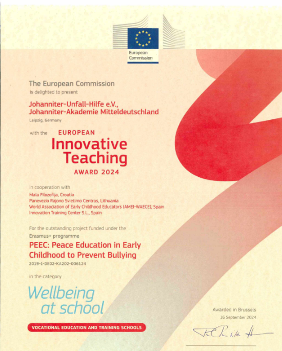 Increíble hito en la trayectoria de Innovation Training Center Nos complace anunciaros que el proyecto PEEC, en el que ITC ha sido socio en España, ha sido reconocido por la Comisión Europea como uno de los 96 proyectos galardonados con el Premio Europeo a la Enseñanza Innovadora (EITA) 2024. Hemos sido premiados en la categoría de formación profesional y propuestos por la agencia nacional alemana, junto con otros 20 proyectos europeos de diferentes países. El certificado con los nombres de los socios hace oficial el premio, que fue entregado el 18 de septiembre durante la conferencia anual de la agencia nacional responsable de la educación profesional en Alemania. Estamos muy orgullosos de este resultado y honrados de haber recibido este increíble premio. Enlaces a publicaciones en alemán y en la web de la Comisión: Agencia nacional alemana – BIBB Enlace EU: Premio Europeo a la Enseñanza Innovadora