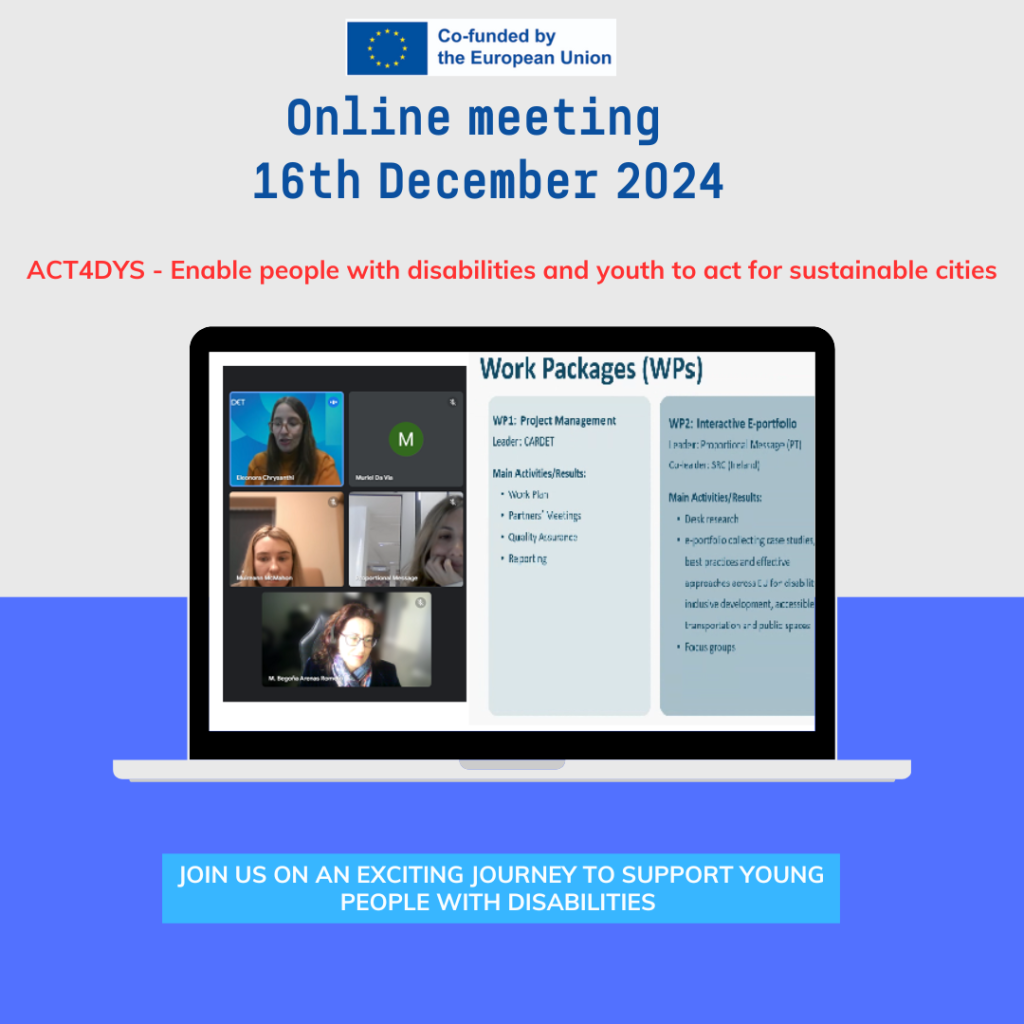 Como ya sabeis, ACT$DYS es un proyecto Erasmus+ Juventud destinado a mejorar la inclusión y sostenibilidad en el desarrollo urbano para jóvenes con discapacidades (ACT4DYS). Este proyecto tiene como objetivo transformar nuestras comunidades urbanas, haciéndolas más accesibles y equitativas para todos y comienza sus andadura en Diciembre de 2024. Hoy nos hemos reunido online con los socios de Portugal, Chipre, Irlanda y Bruselas. Los objetivos del proyecto son: Nos reunimos en Julio y nos hemos vuelto a reunir hoy para avanzar en las actividades para conseguir los objetivos, que son: Estamos contentos por el impacto positivo que ACT4DYS tendrá en nuestras comunidades y esperamos trabajar juntos para construir un futuro más inclusivo y sostenible para todos. ¡Mantente atento para más actualizaciones y eventos relacionados con este proyecto transformador! Fuente de la imagen: ITC.