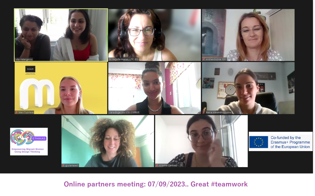 Hoy nos hemos reunido online con los socios de Ethikas: Empowering Migrant Women Using Design THInKing ApproacheS for Sustainable Entrepreneurship para avanzar en el proyecto. En los últimos años, el número de refugiados y migrantes en Europa sigue siendo alto en la mayoría de los países de la asociación ETHIKAS principalmente debido a las guerras y conflictos bélicos: tras Siria y Ucrania, el conflicto entre Israel y Palestina ha venido a recrudecer el panorama migratorio . Como ya os informamos, Ethikas: Empowering Migrant Women Using Design THInKing ApproacheS for Sustainable Entrepreneurship se aprobó en Suecia el pasado Mayo y los promotores son Internationella Kvinnoföreningen – LRC För Kvinnor, con sede en Malmö. Se propone apoyar el emprendimiento social y sostenible de las mujeres migrantes a través de enfoques centrados en el ser humano que las equipen con las habilidades, los conocimientos y la mentalidad necesarias para construir un sistema que funcione para todos: la sociedad, la economía y el medio ambiente. Este objetivo se desarrolla aún más mediante los siguientes objetivos que incluyen el desarrollo de 21 actividades específicas y un manual basadas en el marco típico del Design Thinking (es decir, INSPIRACIÓN – IDEACIÓN – IMPLEMENTACIÓN). Ya hemos implementado 3 reuniones presenciales en Malmö, en Bologna y la tercera se celebró Atenas en Noviembre. Allí los socios se pusieron al día sobre la traducciones de los 21 materiales así como del piloto que se celebrará el año próximo. Esta reunión ha servido para ponerse al día sobre las actividades pendientes de cara a implementar los pilotos en 2024. A lo largo de 2024, habrá tambien 7 eventos multiplicadores que ayudarán a comunicar y difundir los resultados del proyecto y aumentar su visibilidad a nivel local y nacional. Os seguiremos iremos informando sobre Ethikas.