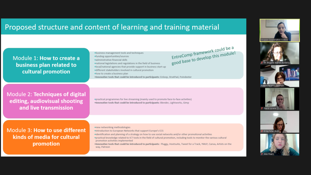 El proyecto Bid2Art se centra en promover el valor social y educativo del patrimonio cultural europeo apoyando a las personas implicadas en su protección y difusión (como músicos, pintores, carpinteros, textiles y otros artistas) en la adquisición y desarrollo de habilidades básicas y competencias clave, utilizando prácticas innovadoras de la era digital. Hoy nos hemos reunido con los socios para ir avanzando en los objetivos del proyecto, que como recordatorio son: 1. Establecer una asociación transversal y transnacional en torno al patrimonio cultural europeo con el fin de promover el patrimonio cultural local o regional a nivel transnacional y crearimpacto sostenible. 2. Crear una propuesta curricular entendida como el marco metodológico orientado a determinar las metodologías óptimas y los itinerarios formativos que acoplen las principales necesidades emprendedoras de artistas p 3. Desarrollar métodos de aprendizaje innovadores centrados en las competencias digitales, con el fin de mejorar el desarrollo profesional 4. Desarrollar un recurso educativo abierto REA con el fin de brindar acceso a prácticas innovadoras y educación tecnológica 5. Desarrollar formación en emprendimiento innovador para músicos, pintores, carpinteros, textiles y otros artistas pertenecientes a minorías étnicas o en riesgo de exclusión social, centrado en el desarrollo de sus competencias clave y habilidades digitales. Todos los socios nos hemos centrado, sobre todo, en el cierre del primero de los 3 resultados, eBook: Curriulum en mentalidad emprendedora, creatividad y uso de las TIC en el ámbito de la promoción cultural. Se ha presentado el calendario de cierre para facilitar el trabajo de los socios. el eBook esta sentando las bases para el curso de formación semipresencial sobre mentalidad emprendedora, creatividad y uso de las TIC en el ámbito de la promoción cultural, así como para la guía de implementación de la educación para el emprendimiento en el ámbito de la promoción cultural. Os iremos poniendo al día sobre los avances de este proyecto.
