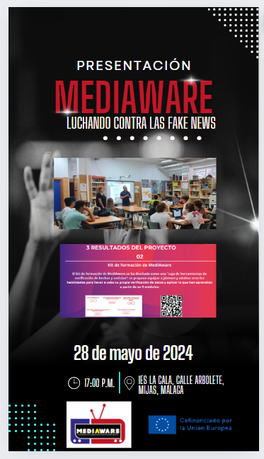 MediAWARE: Media education for all: digital citizens criticise and combat fake news se ha aprobó en Suecia y los promotores son CFL Söderhamn, una autoridad pública con la que venimos trabajando desde hace mas de 7 años, que aúna tres municipios del condado de Hälsingland (Bollnäs, Söderhamn, Nordanstig) en Suecia central. Se centra en la lucha contra las fake news desde una perspectiva de alfabetización que proporcione confianza en el uso de internet y de las redes sociales. se enmarca en la definición de la UNESCO de alfabetización mediática e informacional definida como “[aquella que] permite a los ciudadanos comprender las funciones de los medios y otros proveedores de información, evalúan críticamente su contenido y toman decisiones informadas como usuarios y productores de información y contenido multimedia «. La propuesta se propone capacitar a los educadores sobre estos temas para que sean capaces de formar adecuadamente a adultos y jóvenes en entornos de formación formales y no formales. Hoy hemos realizado el evento multiplicador EN EL IES LA CALA DE MIJAS en el marco de las actividades de formación continua del profesorado mijense y en donde hemos presentado los resultados del proyecto a distintas entidades educativas locales clave. Hemos presentado : Manual de MediAware: El Manual de MediAware: «Medios, ciudadanía y democracia» aborda el tema crítico de la desinformación, las noticias falsas y la ciudadanía activa. Este manual incluye conceptos teóricos y básicos, métodos de capacitación, consejos y pautas de explotación para equipar a los educadores con el conocimiento y las habilidades necesarias para capacitar a sus estudiantes para evaluar críticamente la información y tomar decisiones informadas como usuarios y productores de contenido de medios. El manual sirve como una herramienta esencial para promover la ciudadanía activa, abordar los desafíos de la era digital y las redes sociales, y proporcionar estrategias prácticas para abordar la propagación de noticias falsas y la desinformación. Al usar este manual, los educadores pueden crear un entorno de aprendizaje seguro e informado que promueva los valores democráticos y capacite a los estudiantes para que se conviertan en ciudadanos responsables y comprometidos. Kit de formación de MediAware: El kit de formación de MediAware está respaldado por una caja de herramientas de «verificación de hechos y noticias» para equipar a jóvenes y adultos con las habilidades para llevar a cabo su propia verificación de datos y aplicar lo que han aprendido. El kit de capacitación incluye ejercicios y métodos prácticos, que brindan a los estudiantes el conocimiento y las técnicas necesarias para evaluar críticamente el contenido de los medios, reconocer información errónea y noticias falsas, y tomar medidas contra ellas. Mediante el uso del kit, los estudiantes pueden participar en actividades de verificación de hechos y poner en práctica las habilidades de pensamiento crítico que han adquirido. El kit es una herramienta esencial para promover la alfabetización mediática y la ciudadanía activa, empoderar a las personas y contribuir a la lucha contra la desinformación y las noticias falsas. Plataforma online de MediAware: La plataforma online se centra en dos objetivos temáticos: mejorar la comprensión de los educadores y proporcionar a los alumnos un conjunto de recursos para actuar contra la desinformación y las noticias falsas. La plataforma tiene como objetivo concienciar y desarrollar conocimiento sobre diferentes elementos relacionados con la desinformación, las noticias falsas y la ciudadanía activa. A través de módulos de aprendizaje interactivos y atractivos, la plataforma proporciona una visión general completa de los desafíos de la era digital, equipando a los educadores y estudiantes con los conocimientos y habilidades necesarios para navegar por las complejidades del panorama de los medios.