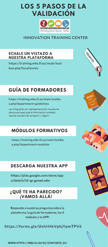 Los materiales del proyecto ERASMUS + Workplace Basic Skills (2018-1-DE02-KA204-005032 «HABILIDADES BÁSICAS EN EL LUGAR DE TRABAJO«) se han desarrollado por ocho socios de ocho países diferentes. El proyecto pretende mejorar las habilidades sociales, de lectoescritura y aritmética en el lugar de trabajo (sectores: construcción, limpieza, cuidado/atención a la dependencia y turismo/servicios) de trabajadores adultos con baja cualificación, especialmente refugiados e inmigrantes. PARA ELLO SE SIRVE DE CUATRO PERSONAJES, Arman, Nedjad, Anna y Karina, que les ayudarán a aprender, de una forma amena y atractiva, sobre habilidades sociales, numéricas y de alfabetización. Os pedimos que reviséis los principales resultados y compartáis con nosotros vuestra opinión: PLATAFORMA: https://training.wbs.ili.eu/main/toolbox.php?localize=es GUÍA PARA FORMADORES: https://training.wbs.ili.eu/main/toolbox.php?department=guidelines MÓDULOS FORMATIVOS: https://training.wbs.ili.eu/main/toolbox.php?department=modules APP: https://play.google.com/store/apps/details?id=gr.gunet.wbs Y NOS RESPONDÁIS A LAS SIGUIENTES PREGUNTAS: https://forms.gle/UxhH4kVphjYpmTPV6 ¡Muchas gracias por vuestra participación!, El equipo de ITC