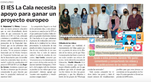 Como ya hemos venido informando en este blog, IPPI, Play with IT se propone integrar la actividad de sensibilización sobre #PropiedadIntelectual centrada en la innovación y el emprendimiento con herramientas innovadoras desarrolladas específicamente para adolescentes de 13 a 18 años de edad. Como ya os informamos el pasado jueves la concejala de educación de Mijas, Mariló Olmedo, así como un equipo de MIJAS COMUNICACION al IES La cala, donde hemos presentado el proyecto @ippiplaywithit: la importancia de la #PropiedadIntelectual en el emprendimiento. Ya han publicado al noticia en el semanal de Mijas, pagina 13 del semanal 944 del 21/05/2021. Han pedido compartir los vídeos, darle me gusta, y darle el mayor número de visualizaciones posibles para que estos jóvenes se conviertan en los ganadores la competición. Para ver los vídeos: www.ippiproject.eu/es/competicion/ o visiten las redes sociales sociales del IES La Cala. ¿Te interesa el tema? Visita nuestra web: https://www.ippiproject.eu/es/ Os iremos informando de este fascinante proyecto.