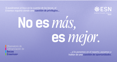 La ESN (Erasmus Student Network) ha lanzado «No es más, es mejor», campaña que abre el telón de la presentación de la V Edición del Observatorio de Cofinanciación de Becas Erasmus+, el mayor análisis y recopilatorio de becas Erasmus+ a nivel estatal y autonómico que se verá la luz el próximo 11 de marzo. Abogando por un reparto más equitativo y justo de las becas Erasmus+, este proyecto no busca simplemente incrementar los fondos disponibles, sino garantizar que cada estudiante, sin importar su origen socioeconómico, tenga la posibilidad real de vivir una experiencia Erasmus+. Este proyecto es una invitación a repensar lo que significa apoyar la educación internacional, buscando favorecer la difusión de las oportunidades de movilidad disponibles, en línea con los valores y los objetivos de nuestra misión. Esto se materializa con la Calculadora de Becas Erasmus+. Descubre el resto de la campaña en su Instagram @esnspain #NoEsMásEsMejor #ErasmusPlus