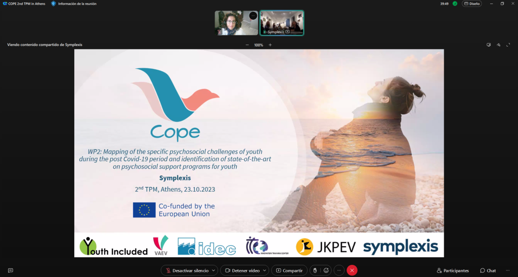 Ya os informamos sobre la primera reunión en Praga y las sucesivas videoconferencias con los socios del proyecto COPE, que se propone fomentar el apoyo entre #jóvenes y así poder afrontar la #ansiedad y el #estrés asociados con la pandemia de COVID-19 y la guerra en Ucrania. Hoy nos hemos reunido de nuevo con todos los socios en Atenas. En este marco recordamos que los objetivos de COPE son: a) identificar los desafíos psicosociales de los jóvenes en circunstancias adversas así como buenas prácticas en los países participantes. b) diseñar y desarrollar de una plataforma de aprendizaje online para el apoyo entre jóvenes bajo la guía de trabajadores profesionales en base a las necesidades identificadas. c) formar a formadores trabajadores juveniles e implementar un piloto para promover el apoyo entre jóvenes. Hoy hemos debatido los contenidos de los módulos la plataforma online: para formadores y jóvenes. ITC ha presentado el borrador del módulo 5 en el que no estamos centrando en terapias de arte visual en general y en fotografía terapéutica en particular. Tambien hemos presentado la estructura del WP4 que empieza en Diciembre. ¡Os iremos informando de las novedades de este proyecto!
