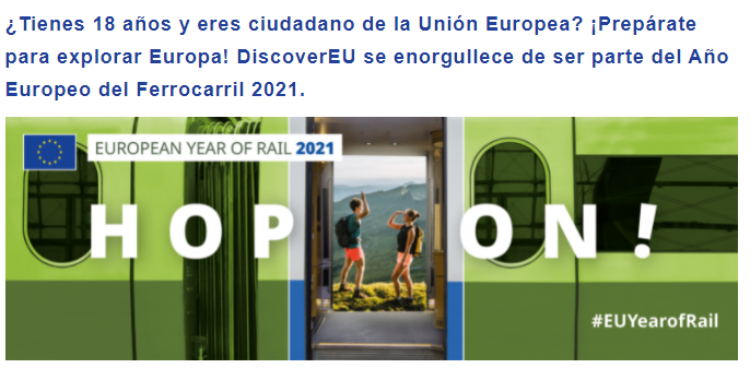 DiscoverEU es una iniciativa de la Unión Europea que brinda la oportunidad, a jóvenes mayores de 18 años, de descubrir Europa a través de experiencias de aprendizaje. Viajando predominantemente en tren (hay excepciones que permiten a quienes viven en islas o en áreas remotas), descubrirán los impresionantes paisajes de Europa y su variedad de ciudades y pueblos. Pueden presentar su solicitud durante las dos rondas de solicitud que tienen lugar cada año. Los solicitantes seleccionados reciben un pase de viaje. Ya están disponibles 60.000 pases de viaje para que los jóvenes viajen por Europa en tren en el marco del programa #DiscoverEU.