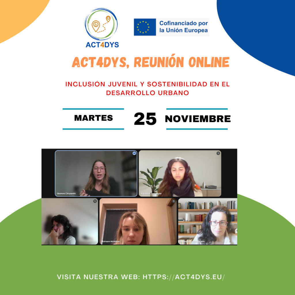 Ya os hemos ido informando sobre la aprobación del proyecto Erasmus+ Juventud destinado a mejorar la inclusión y sostenibilidad en el desarrollo urbano para jóvenes con discapacidades (ACT4DYS). Su objetivo es claro: impulsar la inclusión y la sostenibilidad en el desarrollo urbano para jóvenes con discapacidades, creando comunidades más accesibles y equitativas para todos. La aventura comenzó en diciembre de 2024 y hoy hemos celebrado nuestra primera reunión online con los socios de Portugal, Chipre, Irlanda y Bruselas.