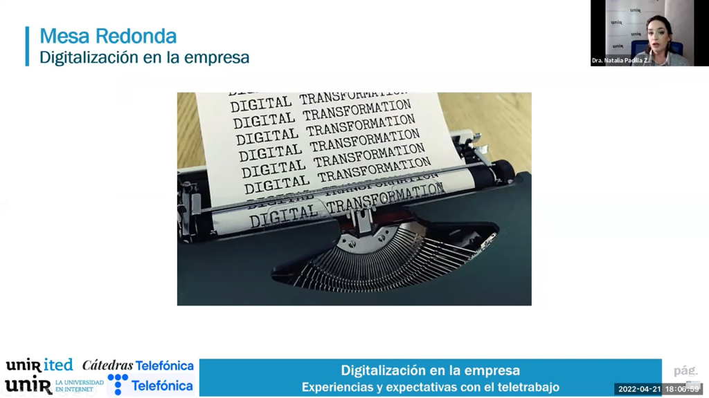 La cátedra Telefónica-UNIR para Sociedad Digital y Educación, enmarcada en el Instituto de Investigación, Innovación y Tecnología Educativas (UNIR iTED), organizó el pasado 21 de abril la mesa redonda “Digitalización de la empresa: experiencias y expectativas con el teletrabajo” y nuestra coordinadora de proyectos, Begoña Arenas, participará como panelista.