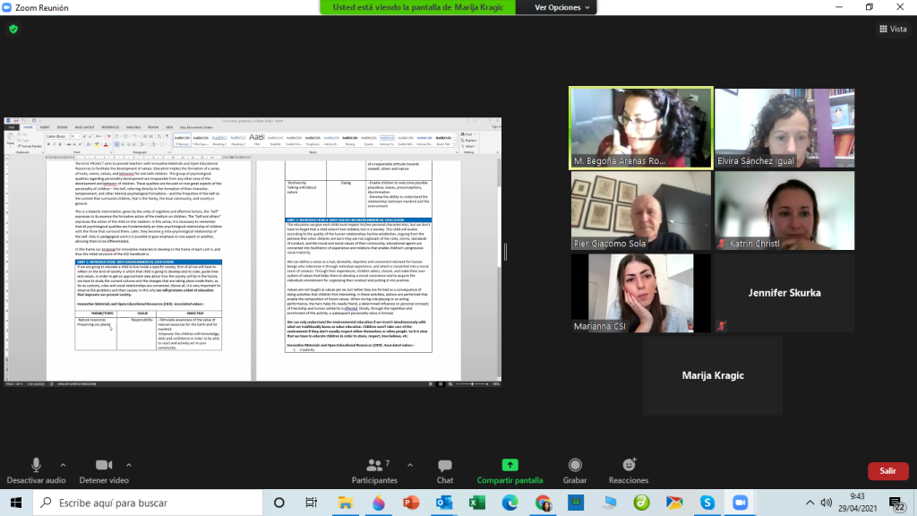 Con el objetivo de lograr la prosperidad durante toda la vida, la Educación Ambiental ayuda a los estudiantes a comprender cómo sus decisiones y acciones afectan el medio ambiente, desarrolla el conocimiento y las habilidades necesarias para abordar problemas ambientales complejos, así como las formas en que podemos tomar medidas para mantener nuestro medio ambiente saludable y sostenible para el futuro. Durante la reunion los socios de ELVE han compartido el trabajo de campo que se está realizando y el borrador del plan de estudios transnacional en educación infantil para docentes centrado en Aprendizaje Ambiental basado en Valores. Esta actividad incluye el diseño de 25 materiales innovadores y distintos recursos educativos abiertos (REA) para docentes y educadores de educación escolar para alumnos de 3-11 años en el campo del aprendizaje Ambiental basado en Valores.